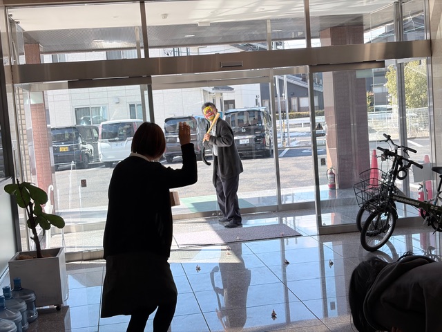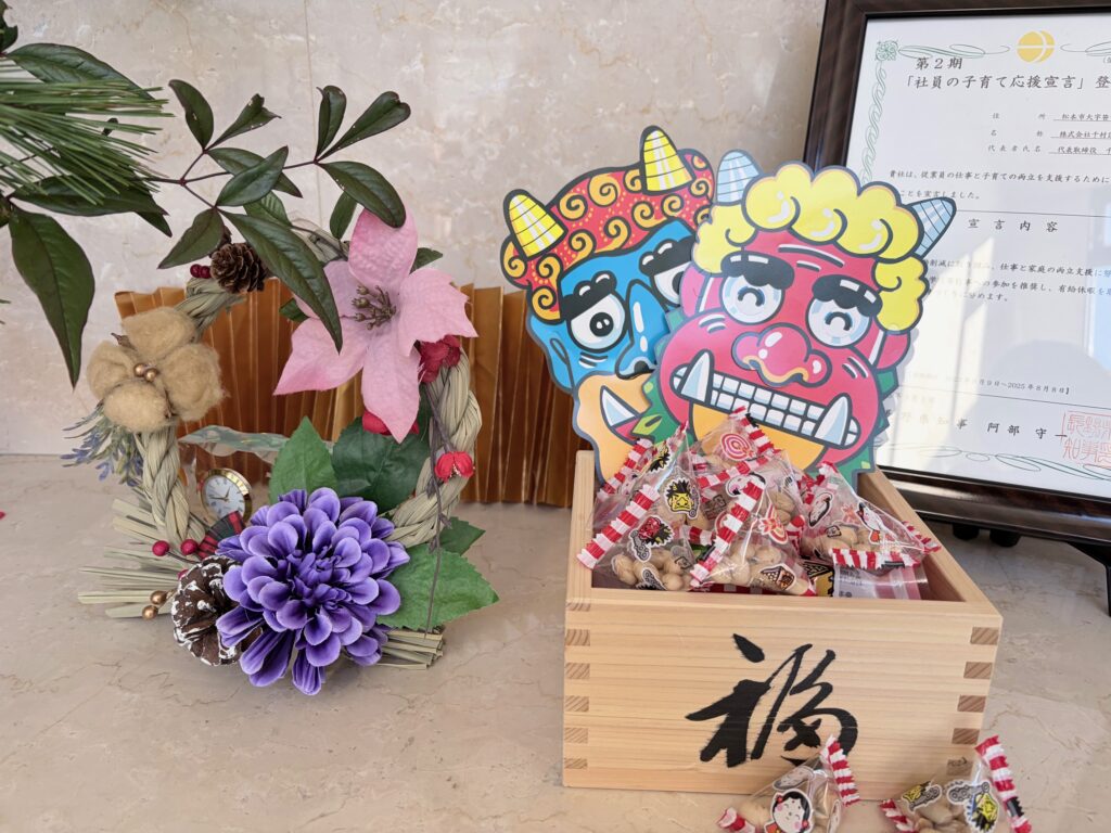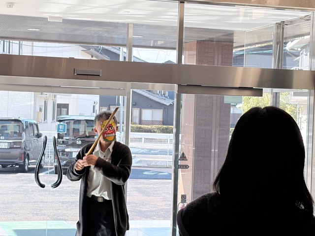 とても弱そうなオニ(支店長)でしたが、一年間無病息災を願いながら豆をなげた女性事務員の方々でした。