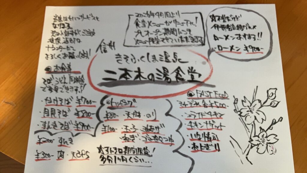 食事メニューをリニューアルしました!おすすめは、木曽名物『五平餅』1本400円。たれは自家製です。
